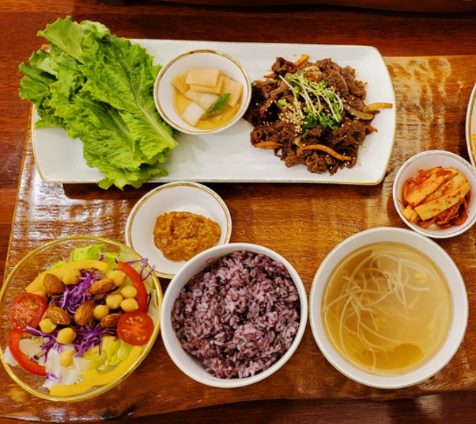 - 현미밥 + 나물반찬 + 구운 생선 + 된장국